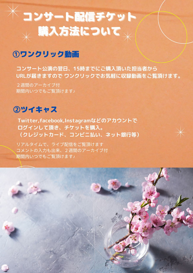 - (各部)チケット代 各部 前売り3,000円 (配信は各部2,000円※2週間アーカイブ付)