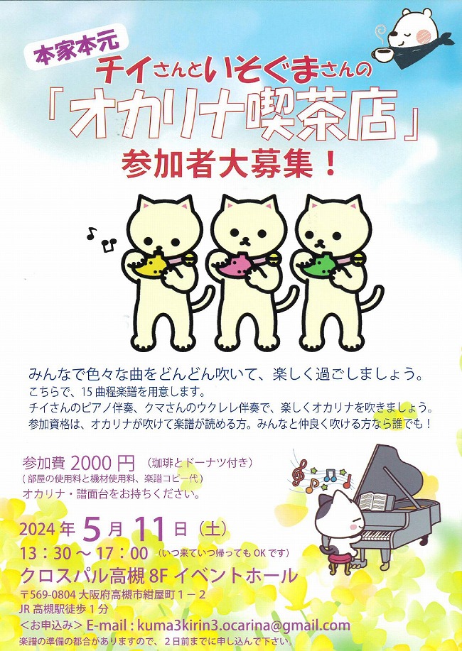 本家本元 チイさんといそぐまさんの「オカリナ喫茶店」 参加者大募集!