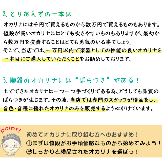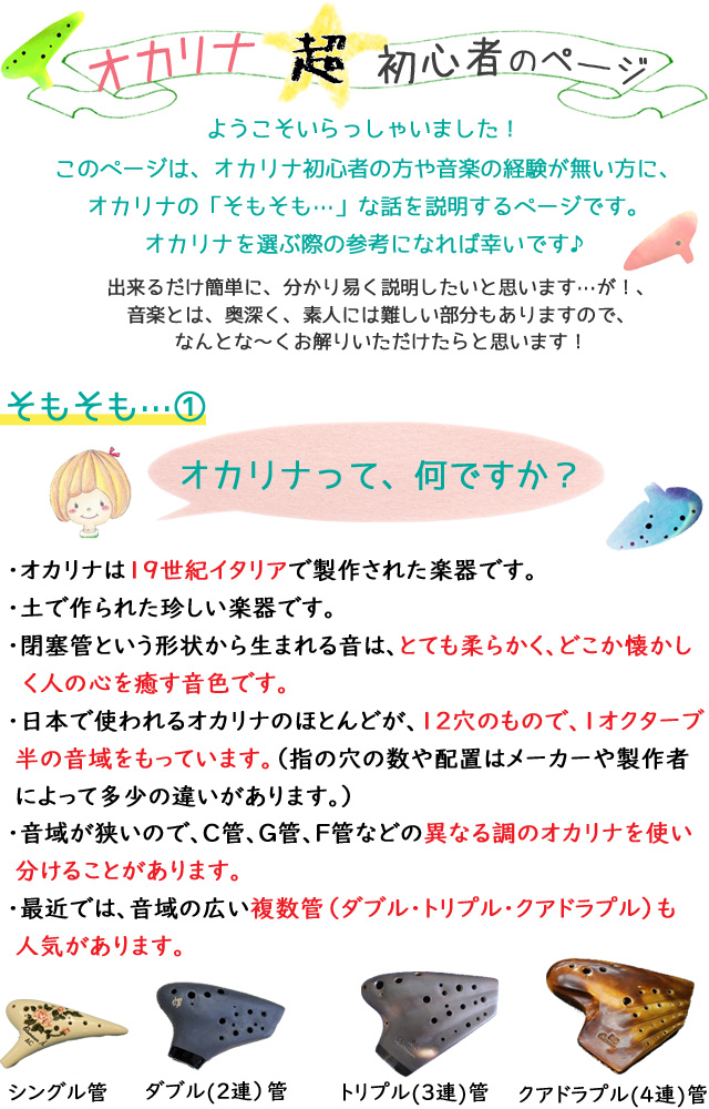 詳しくは「オカリナの種類」、「上手なオカリナの選び方」をご覧ください。