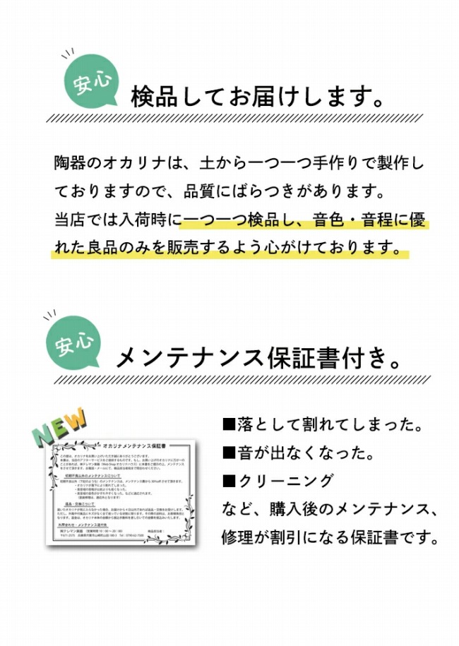 当店ではオカリナを検品・選定する者が最低音から最高音まで鳴りを確認しお届けしております。