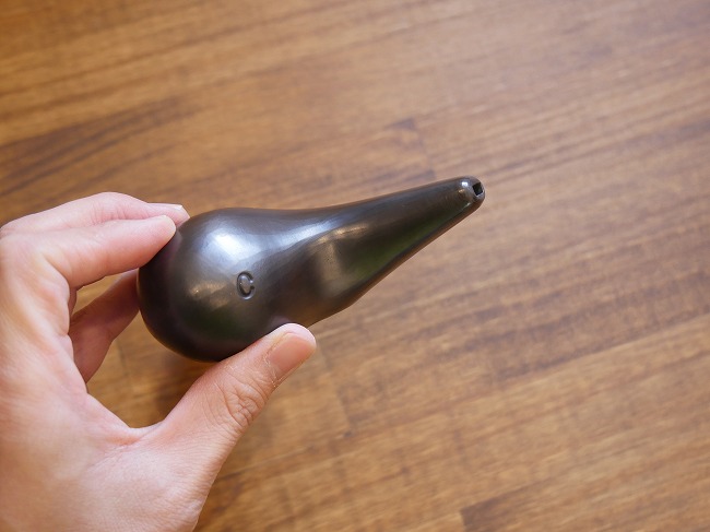 ●ヒロミチオカリナの説明 赤土を焼き上げたオカリナは、更にひと手間加えられ、大鋸屑(オガクズ)で燻し焼きしております。じっくり燻されたオカリナの外観は黒く、黒色の中にうっすら焼き目が残っております。現在は灰を使用した焼き入れ製法で銀色に輝いております。(無着色です。) |