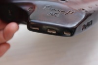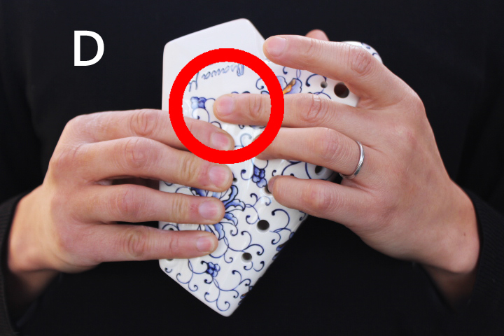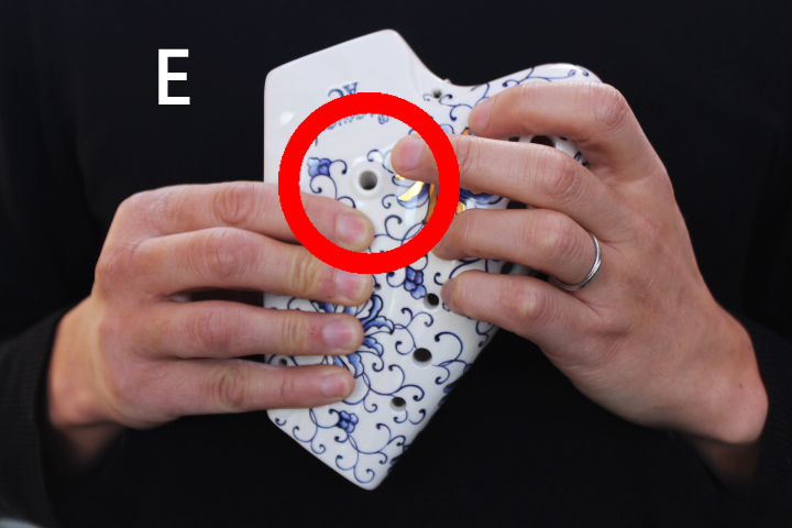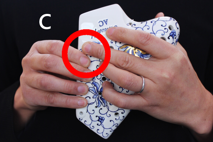 A第1管と第2管をまたぐトリルホール、第2管と第3管をまたぐトリルホールが備わり、「レ-ミ」「ド#-レ#」そして「ド-ド#」「ド-レ」のトリル奏法が容易にできるようになりました。 最高音の「ラ」の音に関しては今までも裏返りの音で出せていましたが、半音下の「ラ♭(ソ#)」の音は音程が曖昧でした。その点、μはきれいに半音階を奏でることができ優れています。特筆すべきはトリルホールです。この発想は素晴らしく、今まで上記のトリルがうまくできず悩んでいた奏者も多いはずです。トリルホールを装着することにより、今まで第1管と第2管、または第2管と第3管を高速で移動しなければできなかったトリル奏法や、速い移音が格段にやりやすくなりました。 具体的には下記の写真のように押さえます。