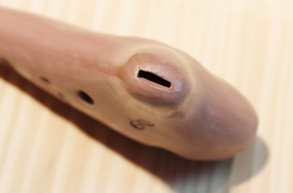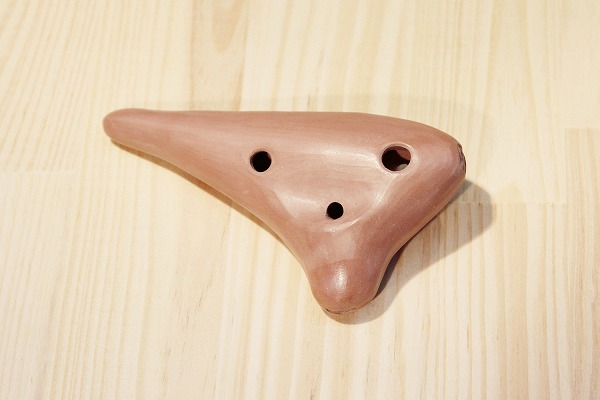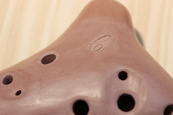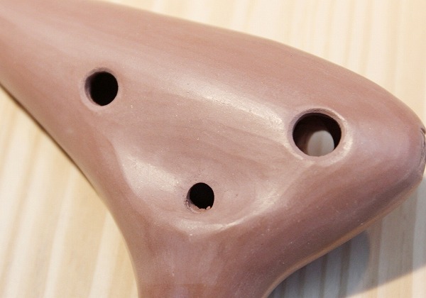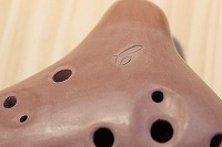 千葉県成田市に工房をかまえ、優しい響きをコンセプトに製作に取り組まれています。 独特な色は古万古(こばんこ)という赤色の土を利用することによって得られたもので、表面のきめの細かさが指先を通じて感じることのできる楽器です。容姿も美しく、手の平にすっとなじむ形状です。吹き口には食器にも使える植物原料のニスを塗布されています。