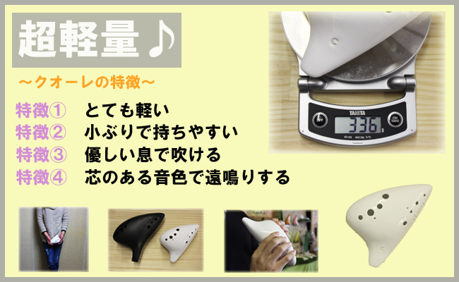 どのぐらい軽いの??次に重量ですが、圧倒的な重量カットに成功したクオーレの重さは「300g台」です。(12穴モデルは300gきる個体もございます。) 音色についてここまで軽いと音色に影響がないか心配になってきてしまいますが、クオーレは軽いと言えども音色が落ちることはございません。 是非ソロ演奏でもアンサンブル演奏でもご活用ください♪ ただ、音量は他のメーカーのバスC管に比べると控えめです。大きな音を出したい方は別のモデルをご選択ください。 ★2種類から選べます★クオーレは最低音が「ラ」まででる12穴モデル(息圧やさしめ)と最低音が1つ少ない11穴モデル(息圧やややさしめ)の2種類ございます。12穴のモデルは全体的に音量が小さく、特に低音の「シ」や「ラ」はとても弱い音量になります。当店のお勧めは11穴モデルです。11穴モデルの方が音域が狭い分、12穴モデルよりも音量を出すことができます。 |