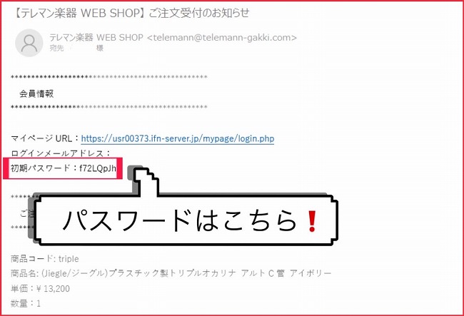 ご注文受付のお知らせメール等に【初期パスワード】が届いておりますので、