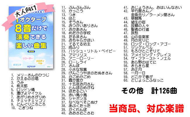 【大人向け楽譜】1オクターブ8音だけで演奏できる楽しい曲集 (教本の内容はこちら)