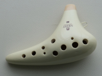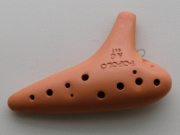 コメント:ヤマハで販売されていたアケタ製のオカリナです。普通の息で吹け、柔らかい音でよく響きます。ナイト運指で、右人差し指の小穴は完全にふさがれています。右中指の小穴は半分ふさがれているように見えますが、この状態で調整されていて、正常です。音階のバランスも良く、当たりの個体だと思います。塗装にムラがあり、右端でコブ状になっています。演奏上は問題ありません。 |
